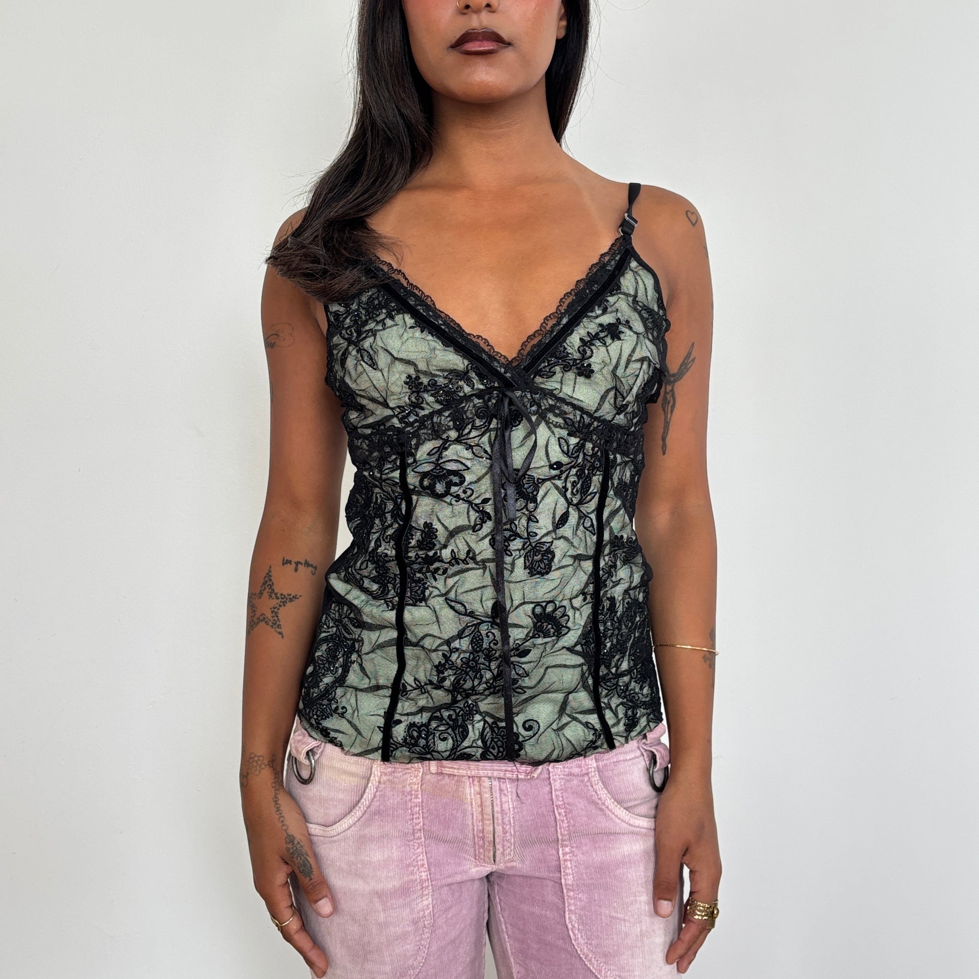 Stunning sparkly green and black mesh and lace detail cami. Modelled on a 6/8. Sourced from Italy.