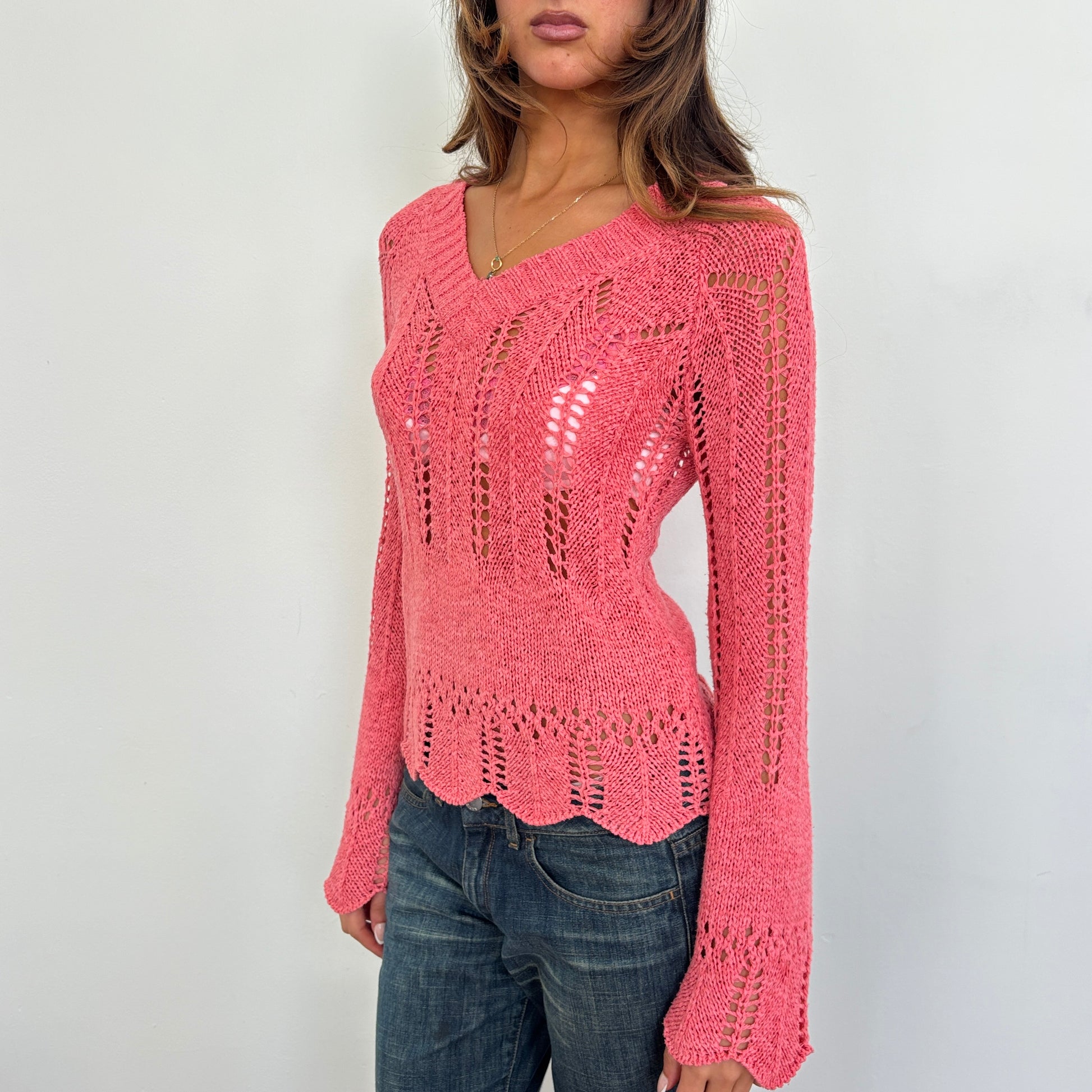The most gorgeous coral knit jumper with flared sleeves and v neck. can't fit XS-L depending on desired fit. Cotton/viscose blend.