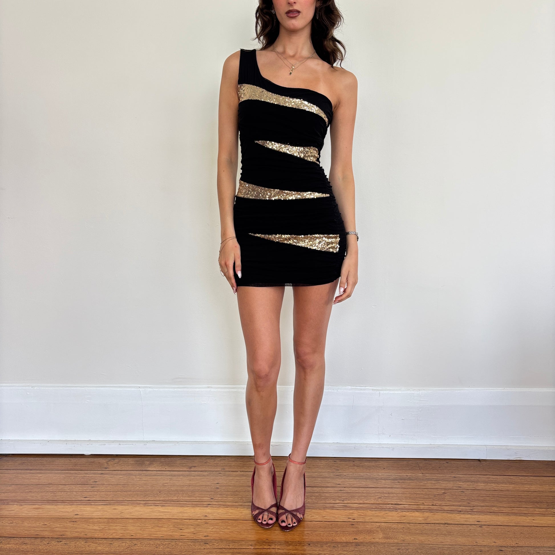 The hottest gold sequin detail asymmetric shoulder dress with a ruched mesh fabric. Stretchy. So hot. Modelled on a 6/8, 174 cm. Sourced from Italy.