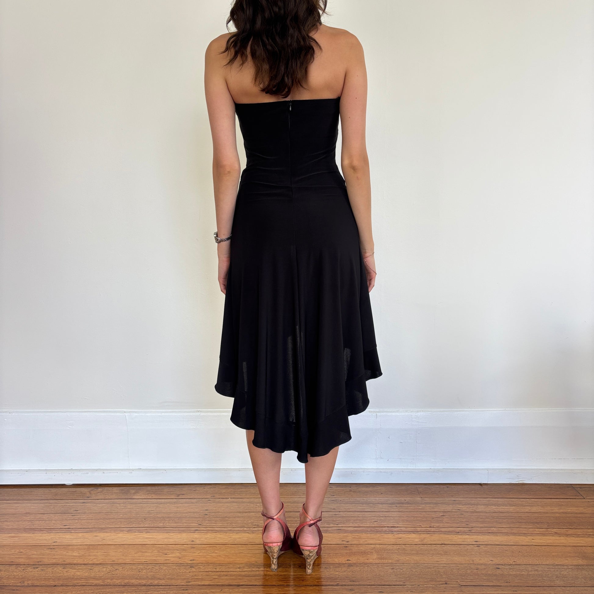 Super hot black midi dress with silver halter neck chain detail. Modelled on a 6/8, 174 cm. Sourced from Italy. Can fit xs/s as is stretchy.