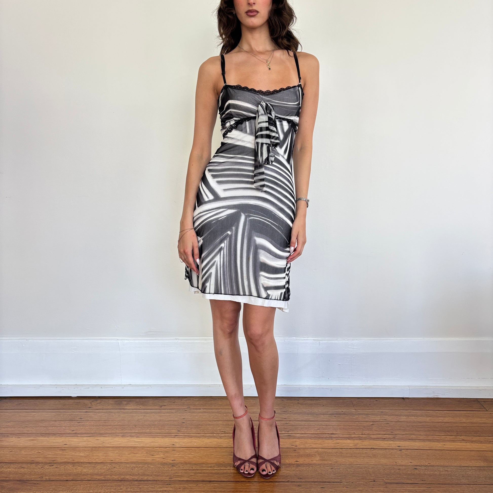 Black and white graphic mesh overlay lace detail midi dress. Modelled on a 6/8. Sourced from Italy.
