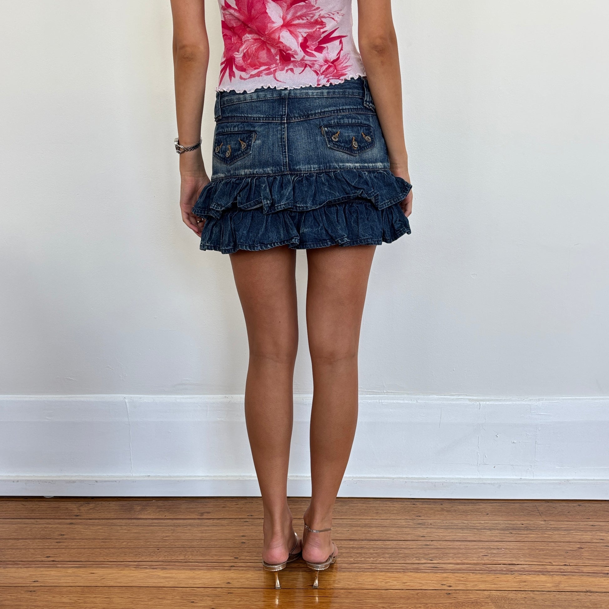 Dark blue ruffle denim mini skirt.