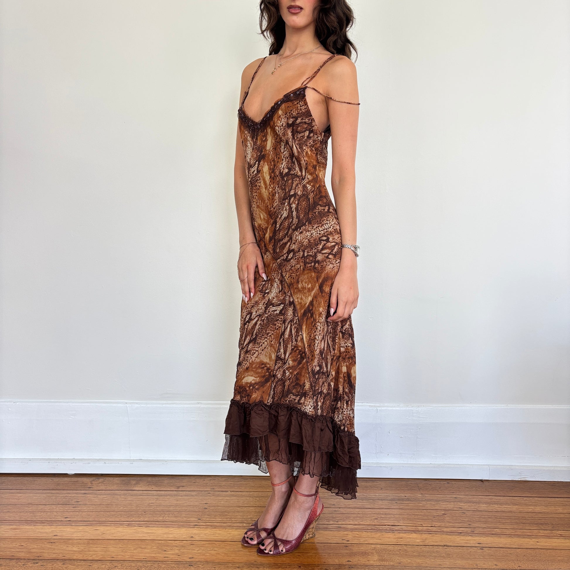 Insane Italian reptile print maxi dress with ruffles. Modelled on a 6/8. Sourced from Italy.