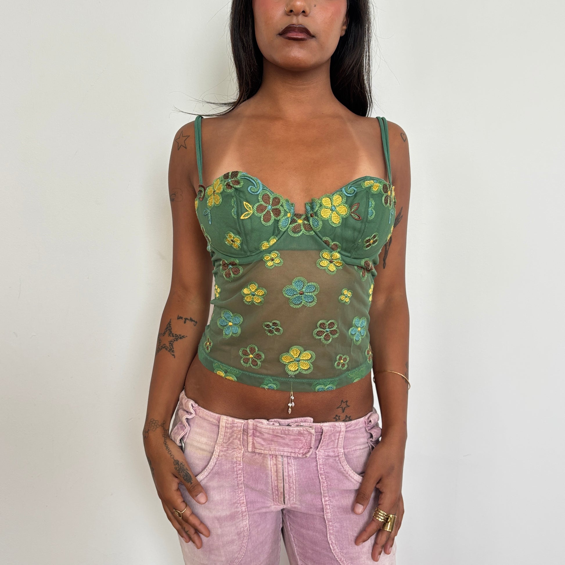Italian made stunning floral embroidered green corset top with mesh detailing. Best fit cups b/c - d Features adjustable straps and hook and eye closure.